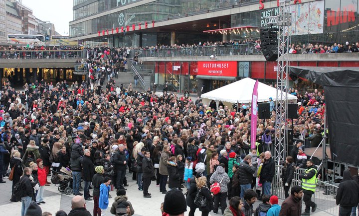 Bara 18 timmar efter segern i Globen stod Eric Saade på scenen igen inför ca 9000 personer på Sergels Torg
